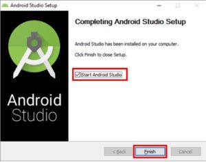 Maka akan muncul Jendela dengan keterangan Completing Android tudio Setup. Biarkan pemilihan Start Android Studio tetap dalam kondisi default atau terceklis dan klik Finish.