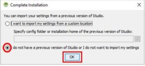 Setelah itu akan muncul jendela baru dengan 2 opsi pilihan. Checklist opsi kedua jika kalian belum pernah menginstal IDE Android Studio dan klik OK.