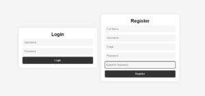 Kode HTML di atas berisi form login dan register yang terletak di dalam sebuah div dengan class “form-container”. Form login dan register memiliki div masing-masing dengan class “form-login” dan “form-register”. Form-login berisi input username, password, dan button login. Sedangkan form-register berisi input full name, username, email, password, confirm password, dan button register.